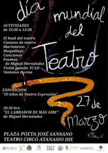 En el cartel anunciador se detallan las citadas actividades, así como la obra de Teatro El labrador de más aire, de Miguel Hernández, que se pondrá en escena a las 20:00 h. en el Teatro Circo Atanasio Die de Orihuela.