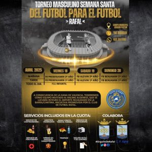 El torneo, que ha sido organizado por el Club Futbol Rafal, con la colaboración del Excmo. Ayuntamiento de Rafal, tendrá como equipo invitado al Racing Algemesí, equipo al que se donará toda la recaudación, en solidaridad por los daños sufridos en la Dana del pasado mes de octubre de 2024.