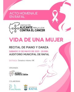 Informamos a nuestros lectores y lectoras del Recital de Piano y Danza «Vida de una Mujer», que tendrá lugar en el Auditorio Municipal de Rafal el próximo sábado, día 31 de mayo, a las 20:00 h., a favor de la Asociación Alicante para la lucha contra el Cáncer, organizado por la citada asociación con la colaboración de la Escuela Pura Danza y el Excmo. Ayuntamiento de Rafal.