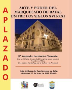 APLAZADA ESTA CONFERENCIA HASTA PRÓXIMAS FECHAS, POR CIRCUNSTANCIAS IMPREVISTAS – MIÉRCOLES, DÍA 11 DE JUNIO DE 2025, A LAS 20:00 H.: CONFERENCIA «ARTE Y PODER DEL MARQUESADO DE RAFAL ENTRE LOS SIGLOS XVII AL XXI», EN LA SALA MULTIUSOS DEL EXCMO. AYUNTAMIENTO DE RAFAL