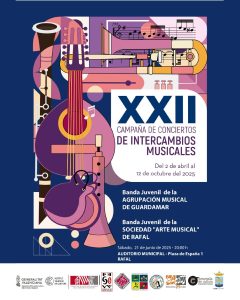 Tenemos el placer de informar a nuestros lectores y lectoras del concierto que tendrá lugar el próximo sábado, día 21 de junio, a las 20:00, en el Auditorio Municipal «Arte Musical» de Rafal, dentro de la XXII Campaña de Conciertos de Intercambios Musicales, en la que participará la Banda Juvenil de la agrupación Musical de Guardamar y la Banda Juvenil de la sociedad «Arte Musical» de Rafal.