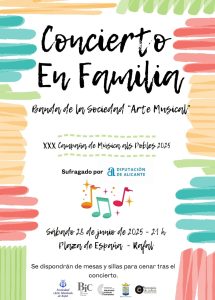 Cartel anunciador del Concierto en Familia. XXX Campaña de Música als Pobles 2025. Excma. Diputación de Alicante. Sociedad «Arte Musical» de Rafal. Bien de Interés Cultural Bic. Manifestación representativa del Patrimonio Cultural Inmaterial. Excmo. Ayuntamiento de Rafal. Concejalía de Cultura Ayuntamiento Rafal.