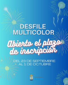 Recogemos en nuestra página la información que ha publicado el ayuntamiento de Rafal sobre el plazo de inscripción para participar en el Desfile Multicolor, que se celebrará el lunes, día 6 de octubre, con motivo de las Fiestas Patronales de Rafal.