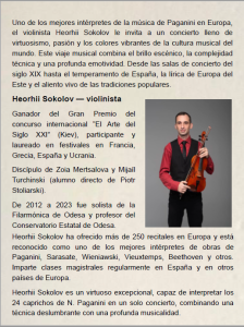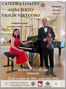 Se trata del concierto que dará, el internacionalmente reconocido violinista ucraniano, Heorhill Sokolov, acompañado por la pianista Anastasiia Meinyk, también nacida en Odesa (Ucrania).